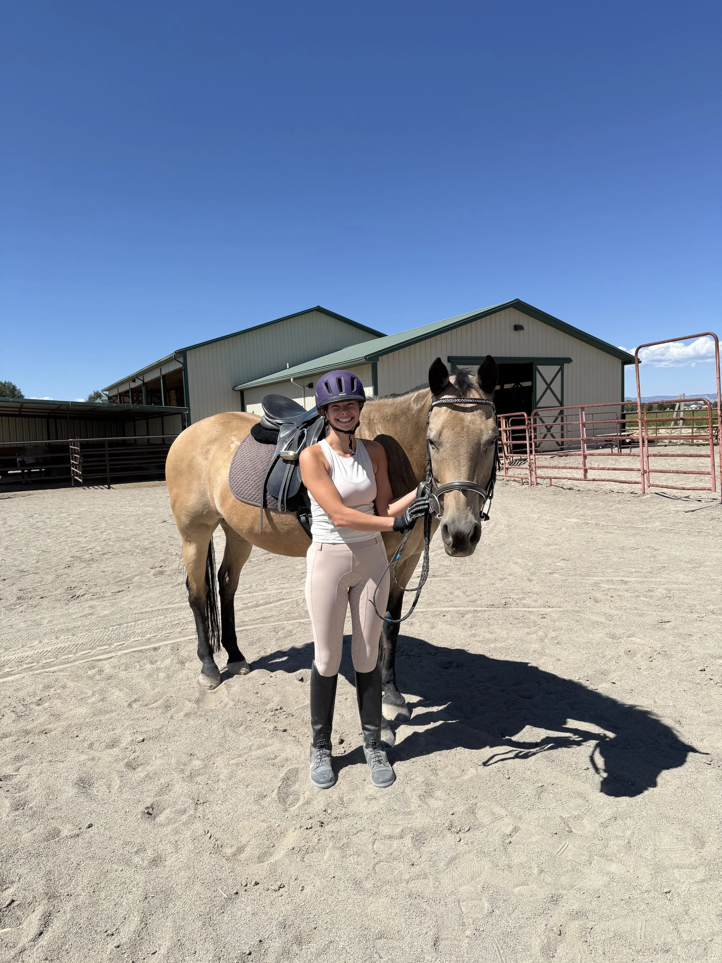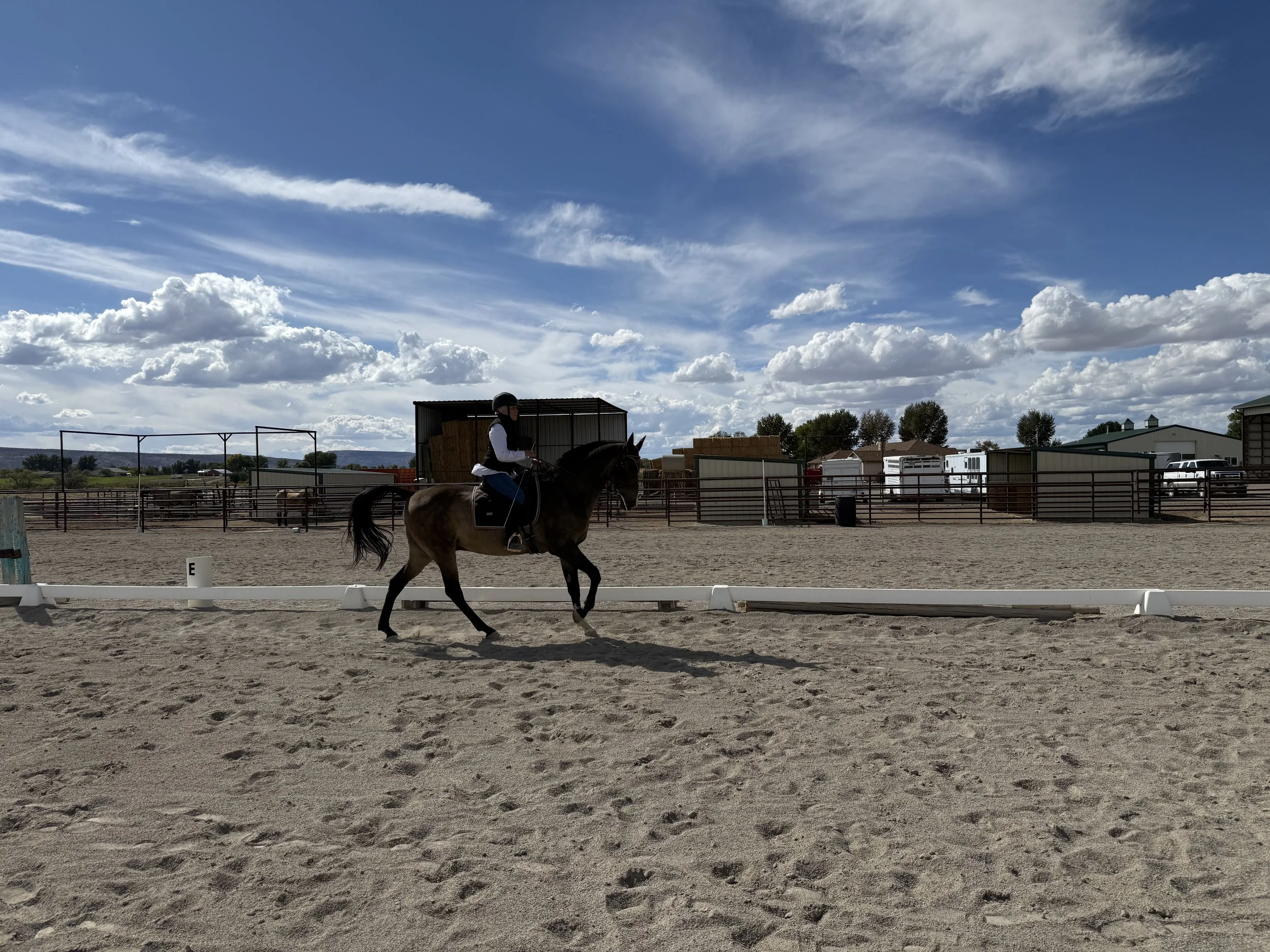 Bud is the all-around good school horse. Bud teaches everyone regardless of age, how to ride. He is patient and calm. He can be ridden intro level to first level, training second level. He meets you where you are at. A great lunge lesson horse for riders too.